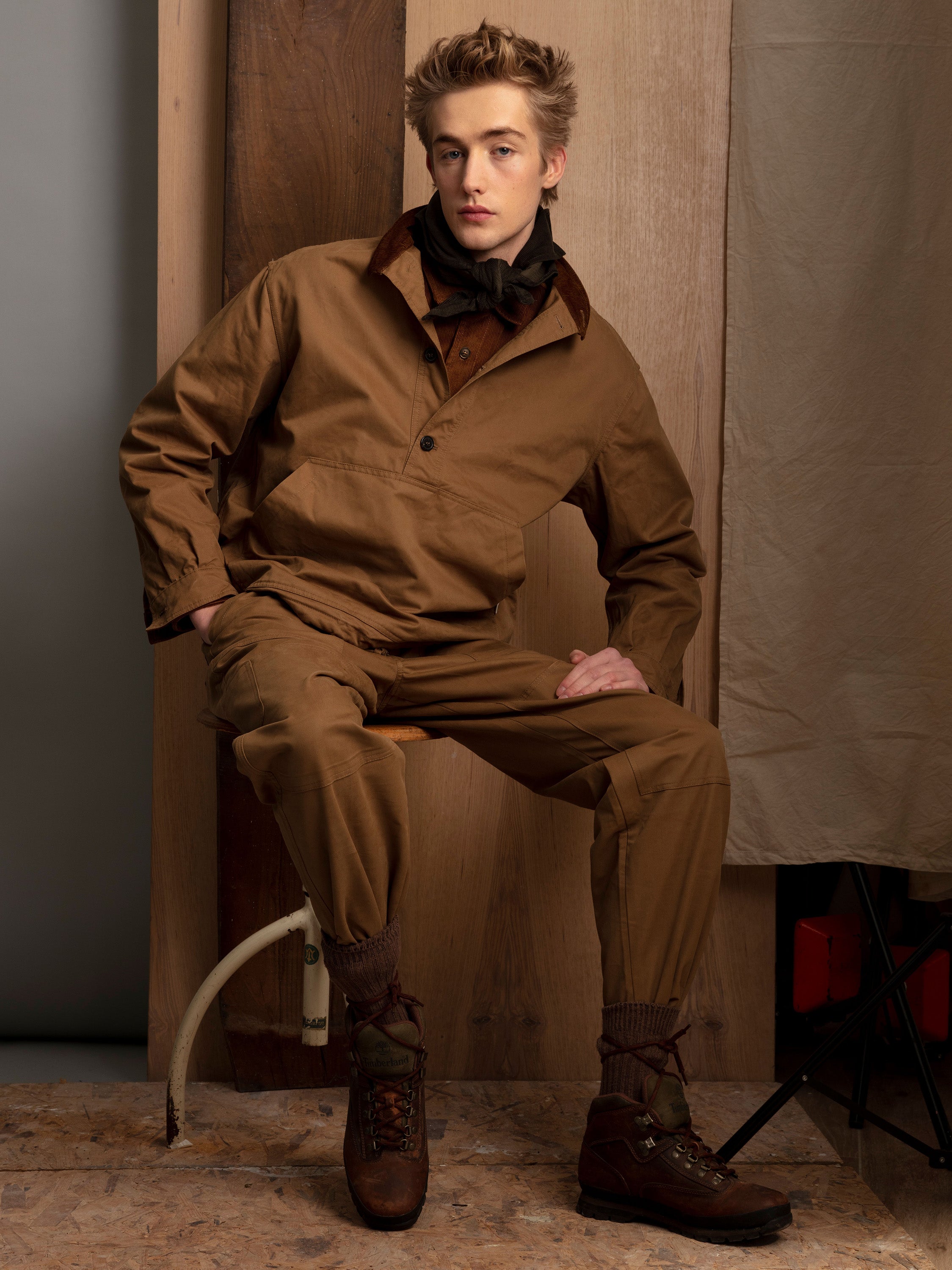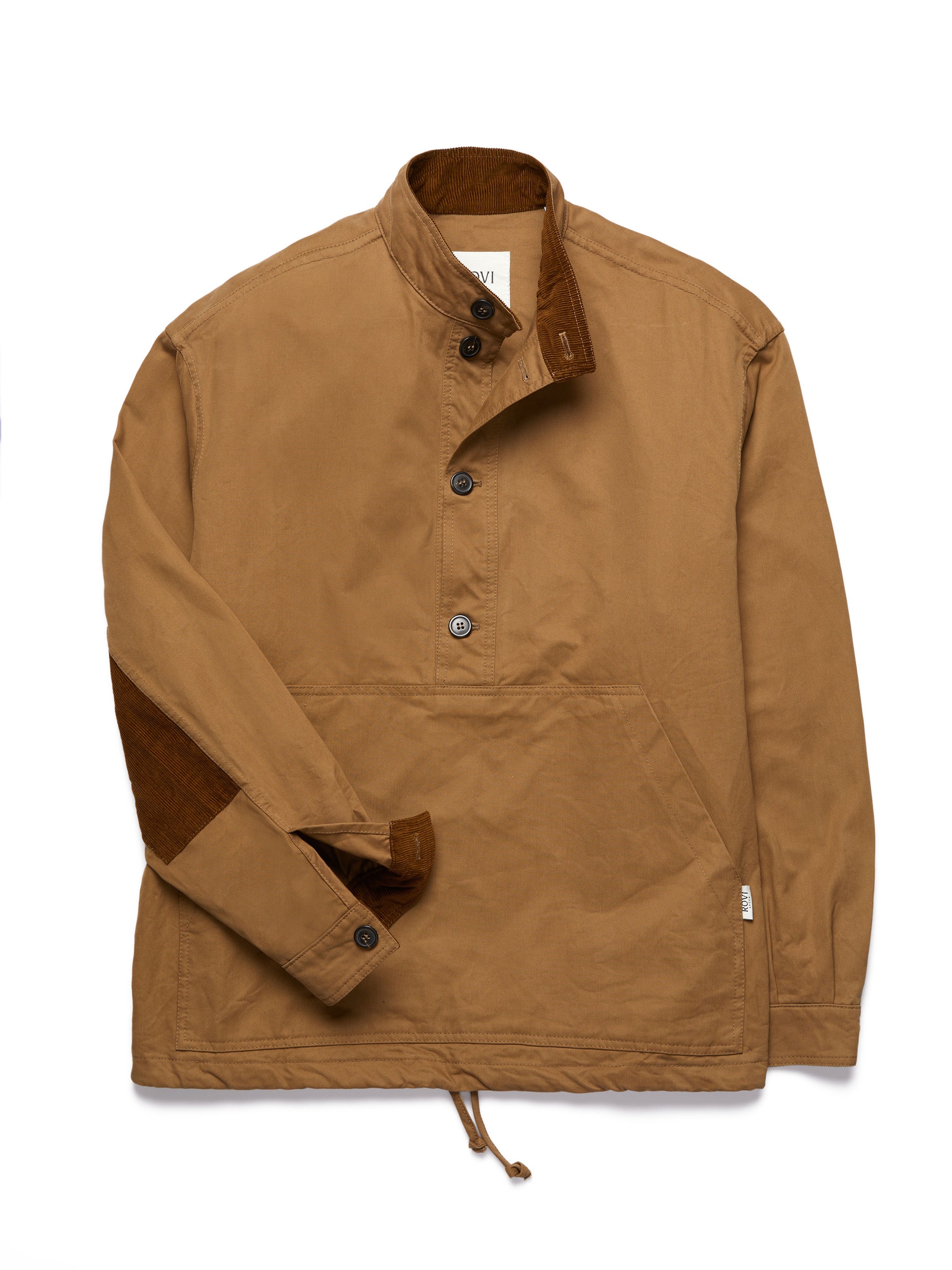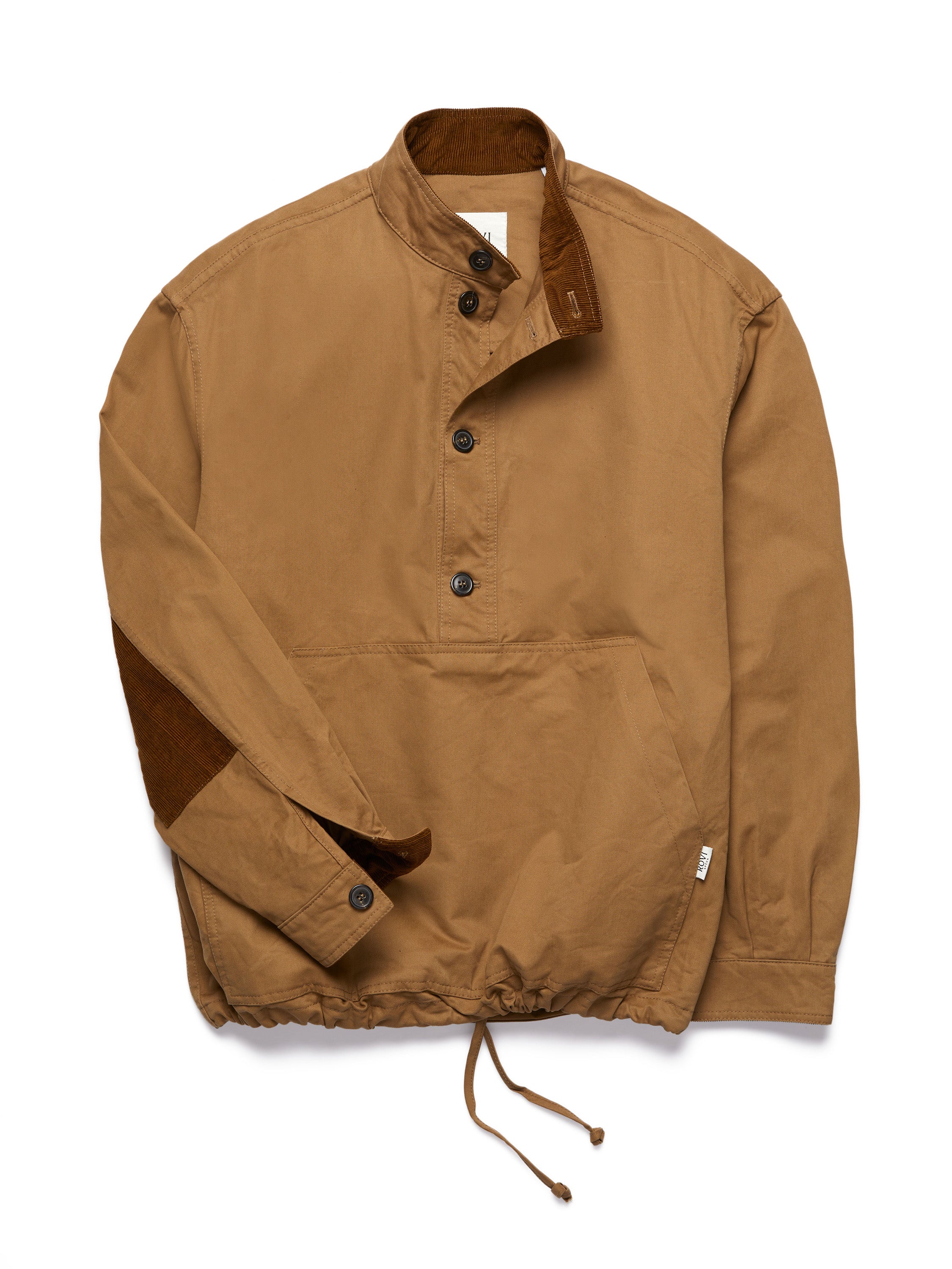 Our seasonal Anorak is crafted from robust drab cotton twill, thoughtfully accented with contrasting cotton velvet corduroy for subtle texture and depth. Designed with a practical utility pocket, button closure, and adjustable drawstring waist, it offers a tailored fit with an easy, relaxed spirit. Its purposeful construction and breathable weight make it a versatile layer for shifting seasons and outdoor pursuits alike.